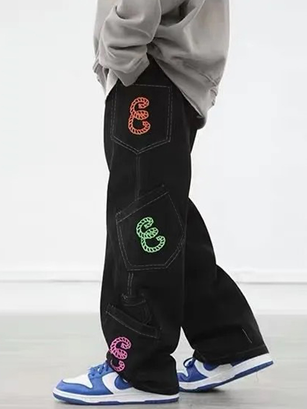 Lose Herrenjeans mit mehreren Taschen und buntem Aufdruck