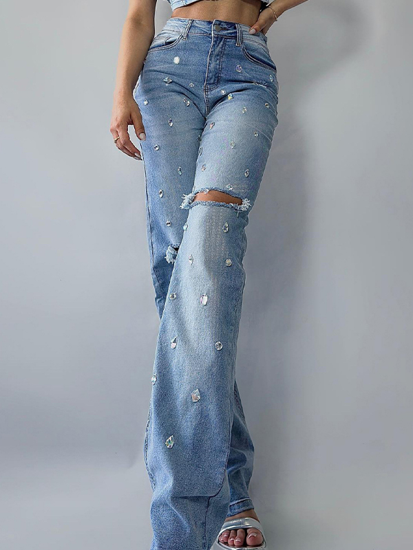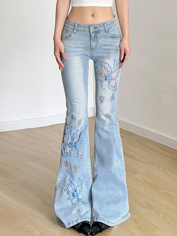Schlagjeans mit Blumenmuster und Perlenstickerei