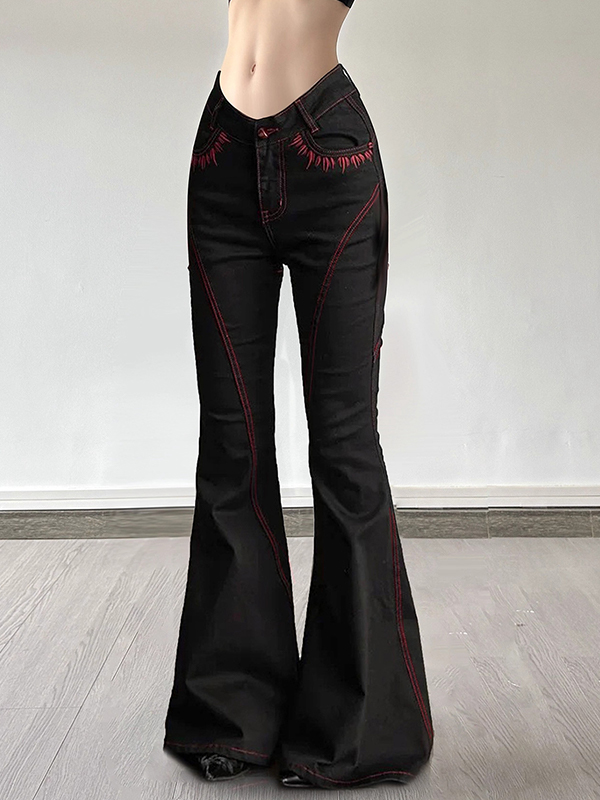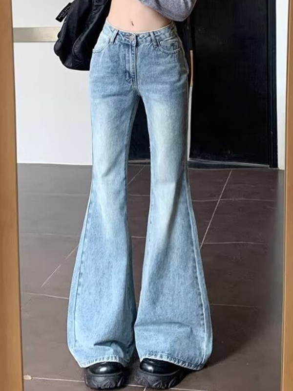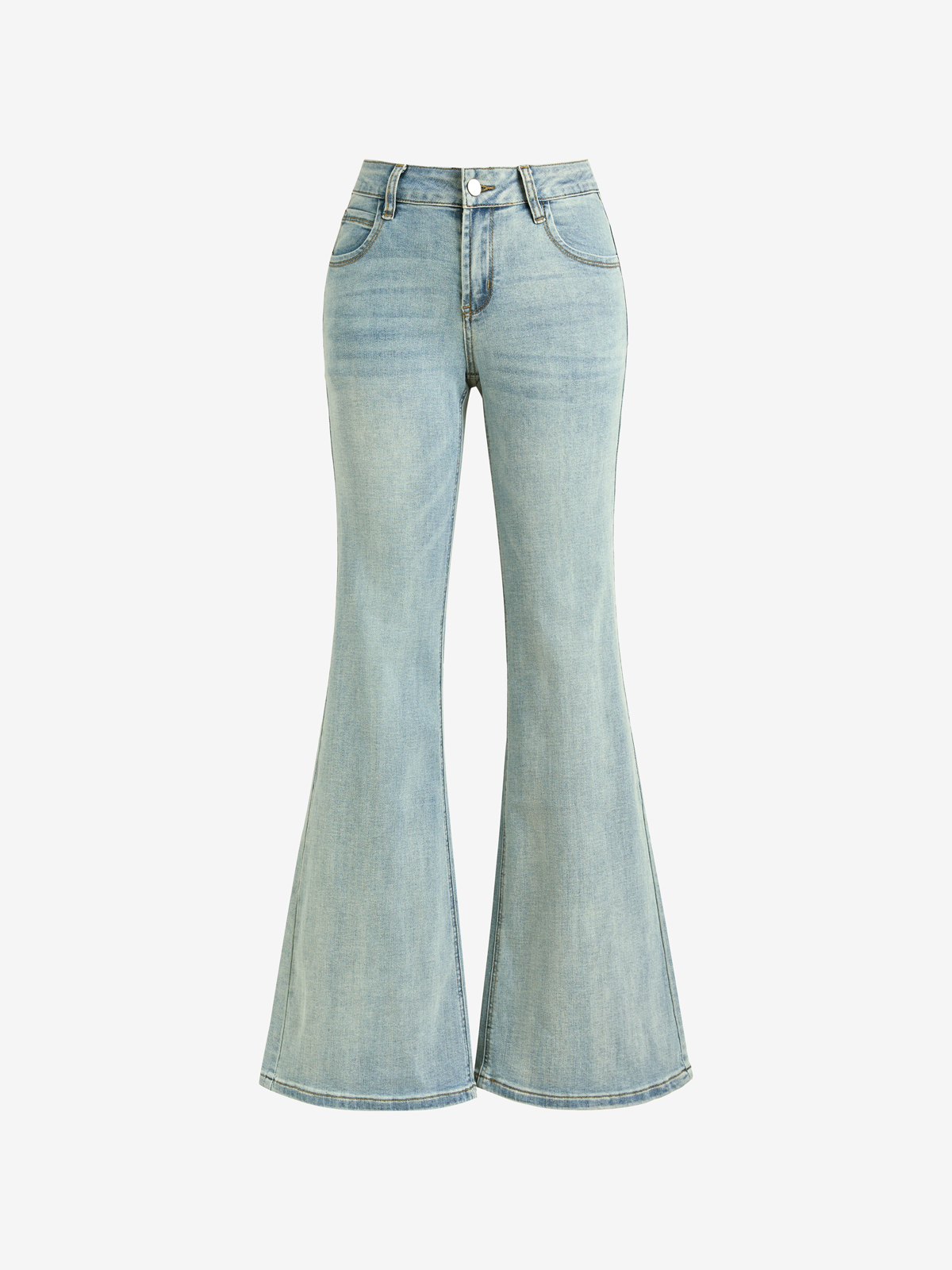 Gewaschene, dehnbare, ausgestellte Jeans mit niedrigem Bund