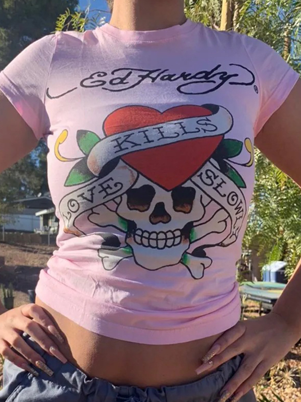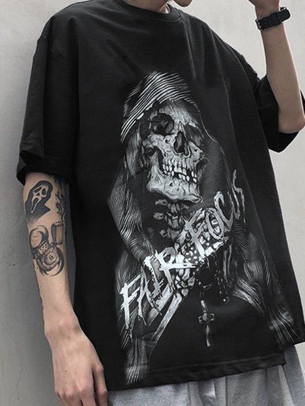 T-Shirts mit Totenkopf- und Rosendruck, kurzärmelig