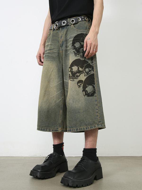 Lockere, lässige Jeansshorts für Herren mit Totenkopf-Print