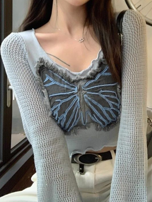Langärmliger Strickpullover mit Denim-Patch und Schmetterlings-Print