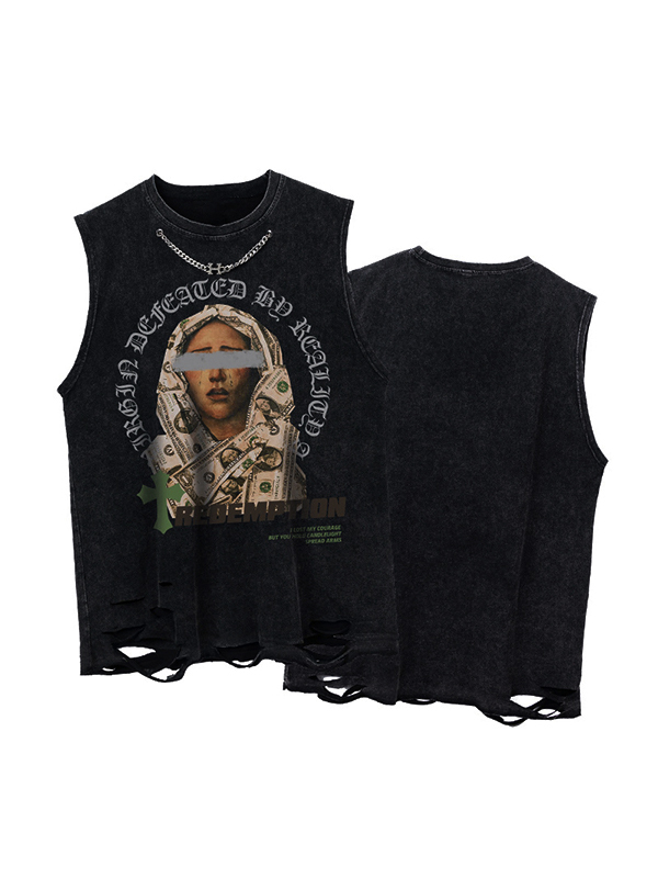 Herren-Weste mit Vintage-Distressed-Portrait-Print und zerrissenem Saum